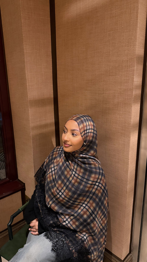 Timeless plaid hijab, designed in a classic tartan pattern with elegant black lace trim. Crafted from a soft, lightweight fabric, it drapes beautifully for effortless styling.